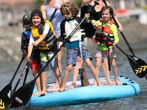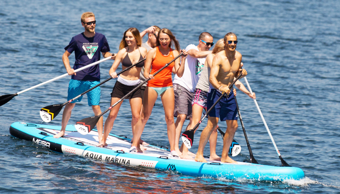 Las tablas MEGA SUP son perfectas para grupos escolares, actividades de Team Building para empresas, cumpleaños, familias y despedidas de soltero o soltera.